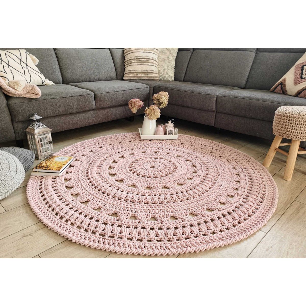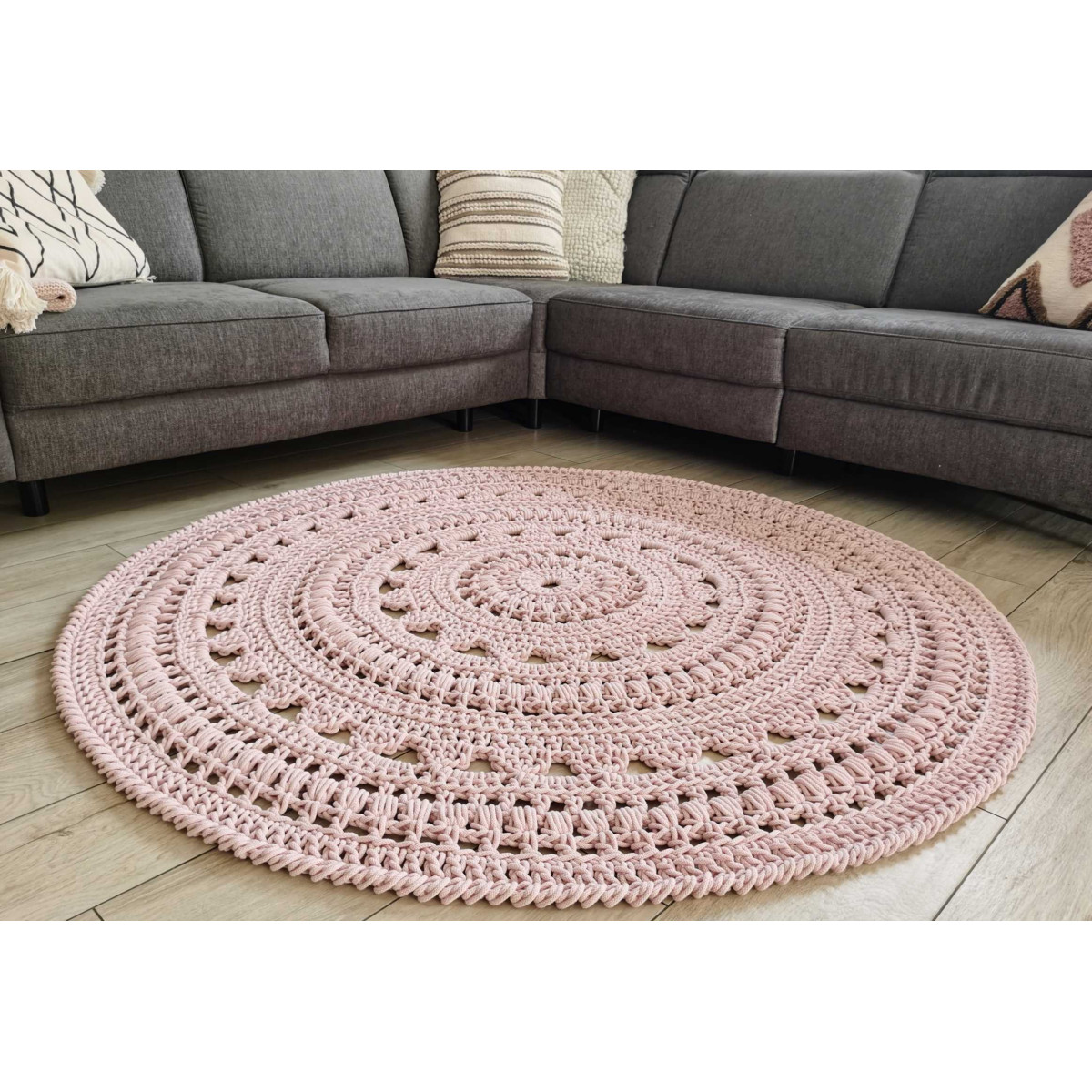 Dywan ze sznurka bawełnianego wydziergany ręcznie na szydełku.